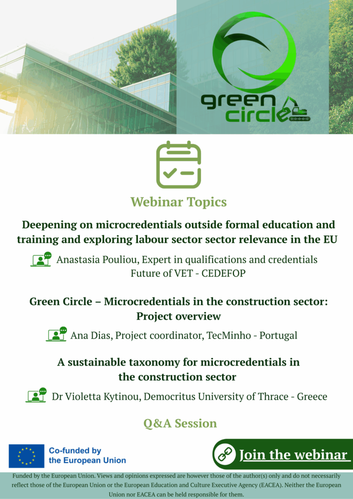 This session will explore the case of the construction sector, one of the key drivers of the EUβs Green Deal objectives. Construction is under strong pressure to modernise, upskill its workforce, and ensure sustainability practices β and microcredentials can play a central role in this transformation.